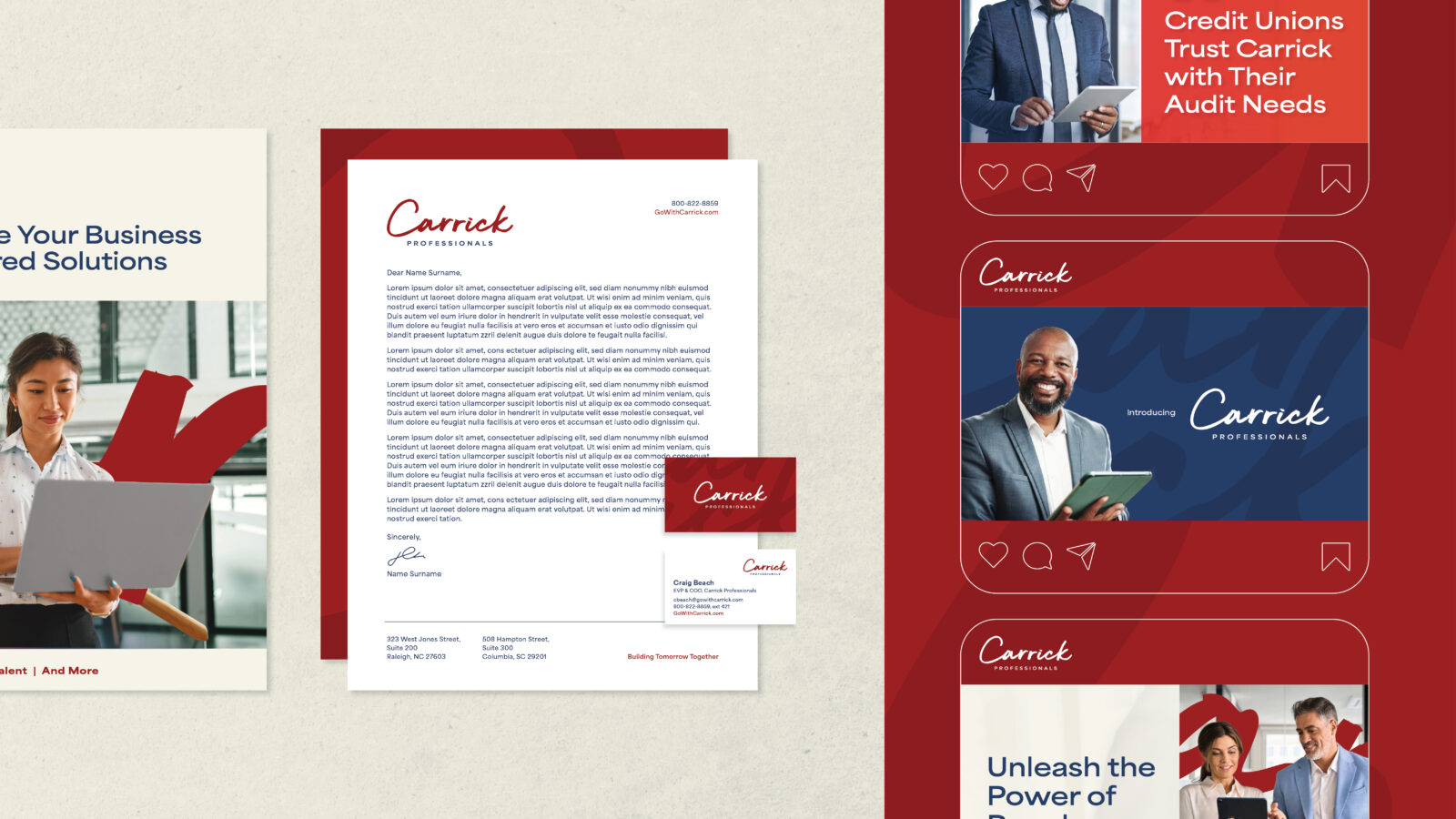 Carrick Professionals accelerate their clients’ business growth through premier professional services solutions. With a national presence rooted in North and South Carolina, Carrick Professionals leverage more than two decades of success working beside the Carolinas Credit Union League to provide solutions such as audit, accounting, and talent recruitment. To further this growth and position their business for continued success, Carrick Professionals worked with Origo Branding to develop a fresh brand presence, focused outreach tactics, and an intuitive website to learn more about the new value propositions of their group, including the broadened services and industries they serve.